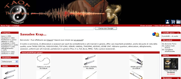 The art of fighting e-commerce, di attrezzature e accessori per sport da combattimento e arti marziali in genere, offre i più importanti produttori, anche dal punto di vista della qualità, come TWINS SPECIAL, RAJA BOXING, TOP KING, VENUM, VANDAL, THAISMAI, ADIDAS, LEONE 1947. Abbiamo guantoni, attrezzature, abbigliamento, accessori, uniformi per arti marziali, pantaloncini in genere (Thai, K-1, Full, Boxe, MMA). Tutto a prezzi eccezionali.